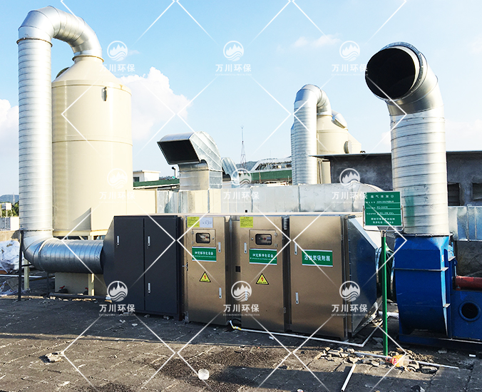 噴漆廢氣主要的成分為有毒的有機氣體和部分粉塵顆粒,首先經(jīng)過通風(fēng)管道將廢氣輸入噴淋塔內(nèi)進行清洗除去粉塵顆粒物,進到干濕過濾器進行干燥和過濾剩余的粉塵,干燥后進入UV光解凈化器,利用UV光解凈化器的原理把廢氣分子裂解,生成水和無機物。其次進入活性炭吸附塔,利用活性炭的多孔性存在吸引力,當(dāng)活性炭與廢氣接觸時活性炭會吸附廢氣分子,最后污染物被處理過后即可排放。