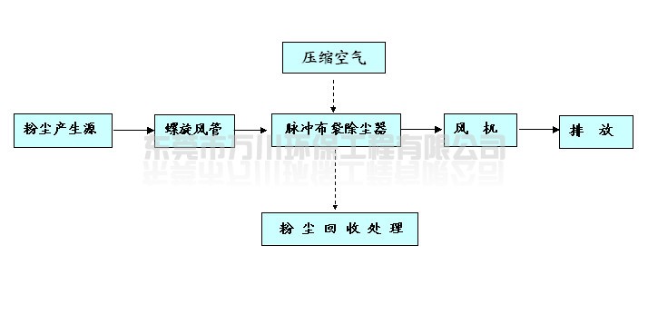 清灰則由設(shè)置定時(shí)控制儀發(fā)出信號(hào),令噴吹系統(tǒng)定時(shí)噴吹。壓縮空氣集氣包順經(jīng)脈沖閥和噴吹管上的噴嘴向?yàn)V袋內(nèi)噴射,濾袋因此而急驟膨脹,在產(chǎn)生的加速度和反向氣流的作用下,附于袋內(nèi)的粉塵脫落到灰斗,粉塵由卸灰口排出。