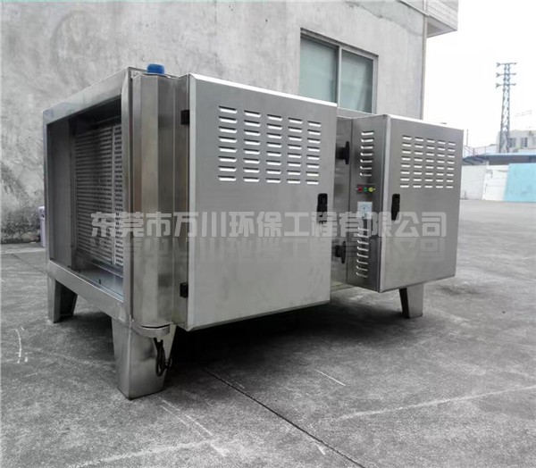 飯?zhí)糜蜔熅哂幸欢ǖ亩拘裕瑴囟雀?、有腐蝕性,長期吸入對人體造成嚴重的傷害,而且還會對周邊環(huán)境造成污染,要經(jīng)過處理后才可以排放。鑒于對這類污染物的特點,我們采用了等離子凈化器去處理,設備使用耐腐蝕、耐高溫的不銹鋼作為設備的材料,可以延長設備的壽命。通風管也是采用了耐腐蝕耐高溫的材料制作而成的,通風管道中間安裝過濾網(wǎng),可以在油煙進去的時候過大顆粒的污染物。